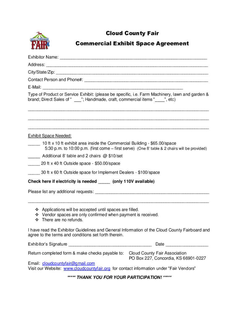 Cloud County Fair Commercial Exhibit Space Agreement Exhibitor Name: ___ Address: ___ City/State/Zip: ___ Contact Person and Phone#: ___ Email: ___ Type of Product or Service Exhibit: (please be specific,
