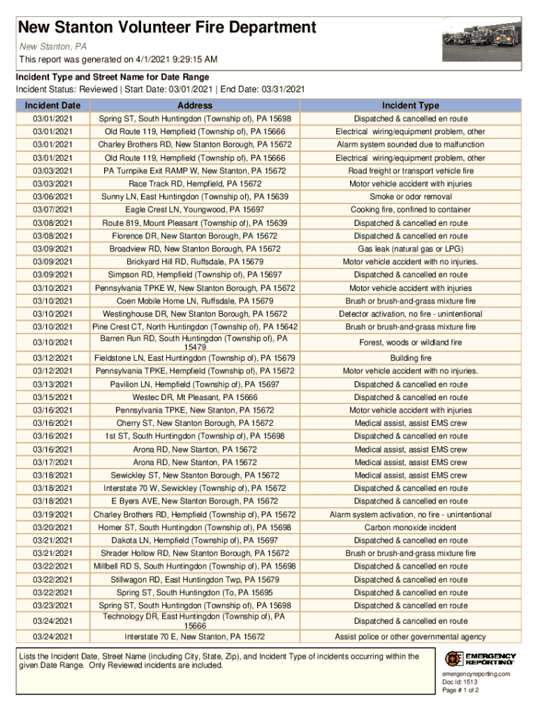 New Stanton Volunteer Fire Department New Stanton, PA This report was generated on 4/1/2021 9:29:15 AM Incident Type and Street Name for Date Range Incident Status: Reviewed | Start Date: 03/01/2021