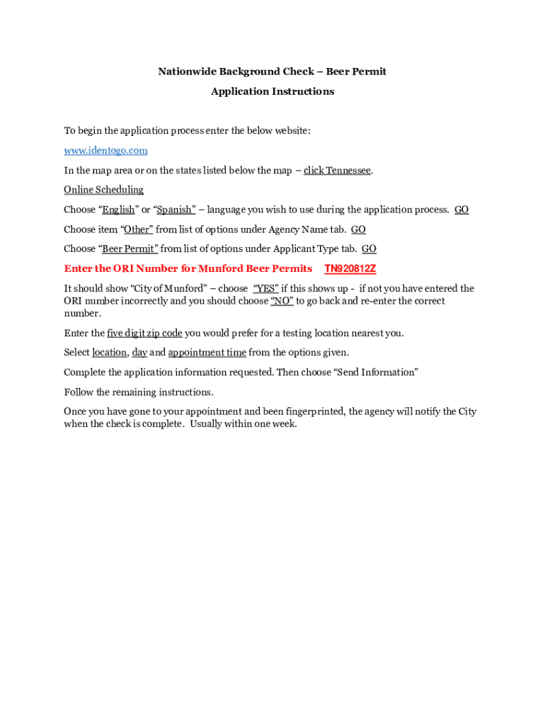 Nationwide Background Check Beer Permit Application Instructions begin the application process enter the below website: www.identogo.com In the map area or on the states listed below the map click