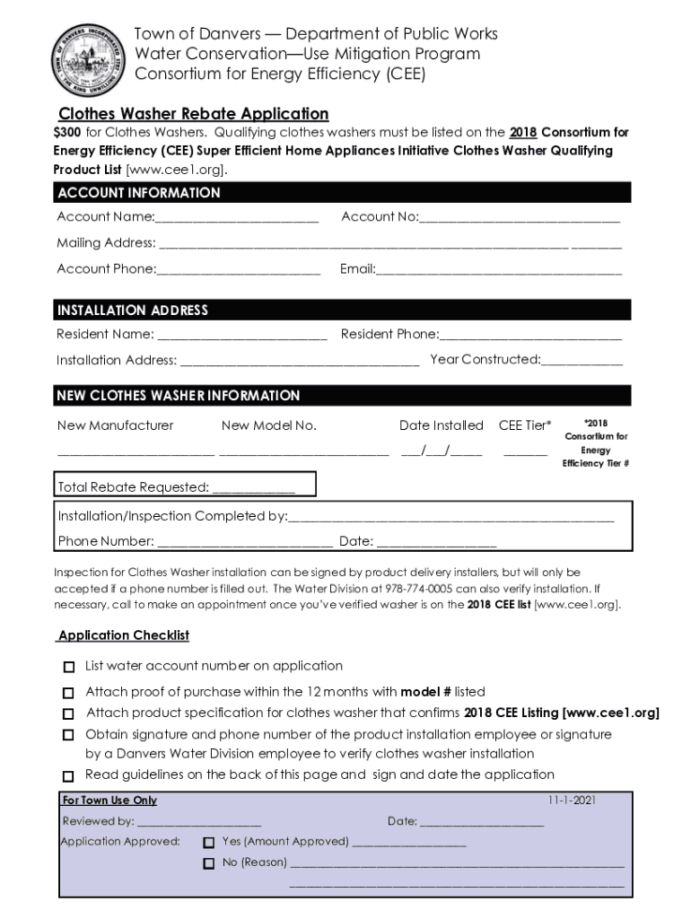 Town of Dancers Department of Public Works Water Conservationist Mitigation Program Consortium for Energy Efficiency (CEE) Clothes Washer Rebate Application $300 for Clothes Washers. Qualifying clothes