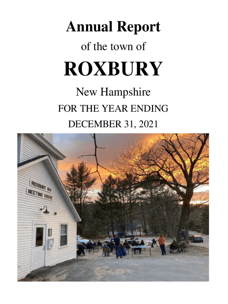 Annual Report of the town Roxbury New Hampshire FOR THE YEAR ENDING DECEMBER 31, 2021The Cover The cover photo, taken by Alice Funk is of the Roxbury Annual Town Meeting on April 6, 2021. After a