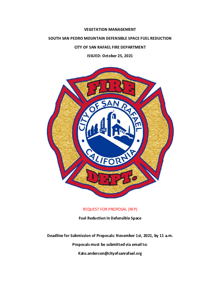VEGETATION MANAGEMENT SOUTH SAN PEDRO MOUNTAIN DEFENSIBLE SPACE FUEL REDUCTION CITY OF SAN RAFAEL FIRE DEPARTMENT ISSUED: October 25, 2021REQUEST FOR PROPOSAL (RFP) Fuel Reduction in Defensible SpaceDeadline