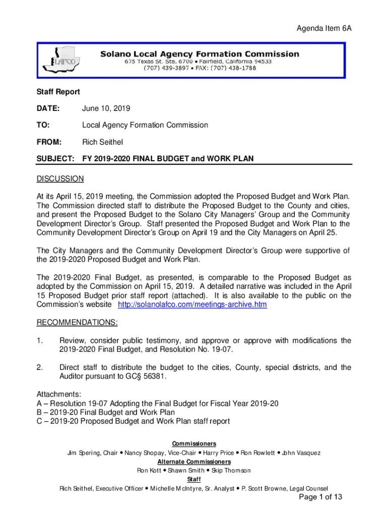 DATE:June 10, 2019TO:Local Agency Formation Commissioner:Rich SeithelSUBJECT:FY 20192020 FINAL BUDGET and WORK PLANDISCUSSION