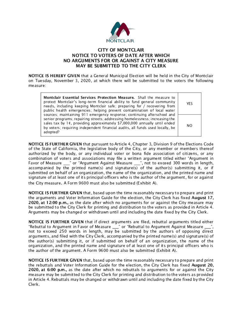 CITY OF MONTCLAIR NOTICE TO VOTERS OF DATE AFTER WHICH NO ARGUMENTS FOR OR AGAINST A CITY MEASURE MAY BE SUBMITTED TO THE CITY CLERK NOTICE IS HEREBY GIVEN that a General Municipal Election will be