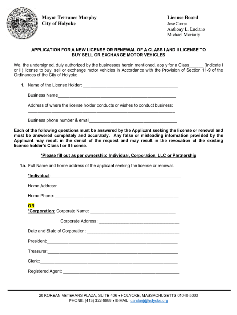 Michael MoriartyAPPLICATION FOR A NEW LICENSE OR RENEWAL OF A CLASS I AND II LICENSE TO