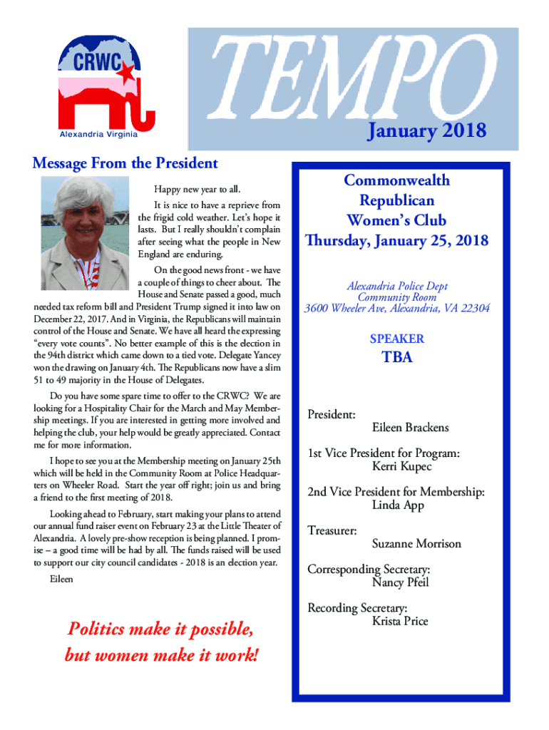 January 2018 Message From the President Happy new year to all. It is nice to have a reprieve from the frigid cold weather. Let's hope it lasts. But I really shouldn't complain after seeing what the