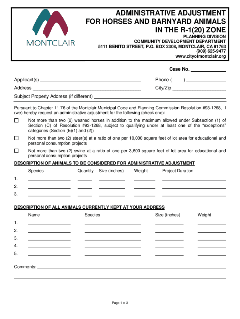ADMINISTRATIVE ADJUSTMENT FOR HORSES AND BARNYARD ANIMALS IN THE R1(20) ZONE PLANNING DIVISION COMMUNITY DEVELOPMENT DEPARTMENT 5111 BENITO STREET, P.O. BOX 2308, MONTCLAIR, CA 91763 (909) 6259477