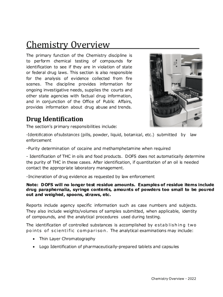 Chemistry Overview The primary function of the Chemistry discipline is to perform chemical testing of compounds for identification to see if they are in violation of state or federal drug laws. This
