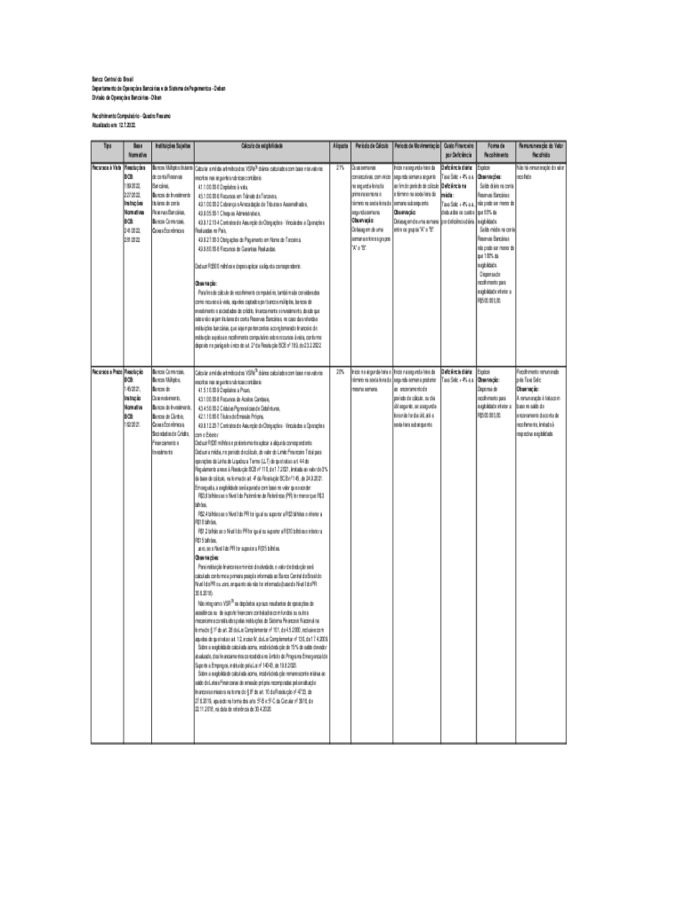 Banco Central do Brazil Department de Operaes Pancreas e de System de Pagamentos Dean Divisor de Operaes Pancreas Divan Recolhimento Compulsion Squadron Resume Actualized em: 12.7.2022. Kilobase NormativaRecursos