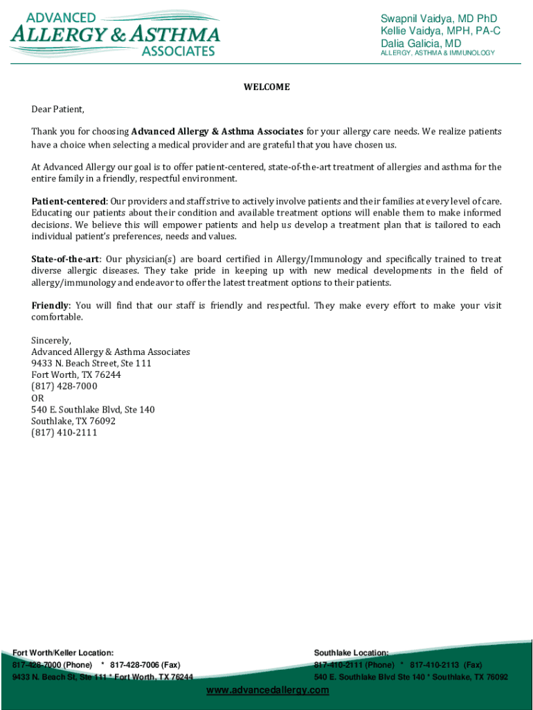 Swap nil Vienna, MD PhD Kellie Vienna, MPH, PAC Dalian Galicia, MD ALLERGY, ASTHMA & IMMUNOLOGYWELCOME Dear Patient, Thank you for choosing Advanced Allergy & Asthma Associates for your allergy care