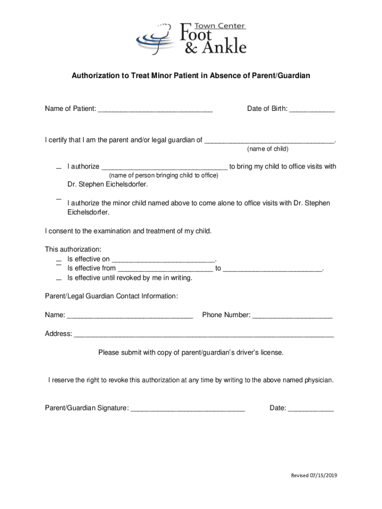 Get the free Authorization to Treat Minor Patient in Absence of Parent ...