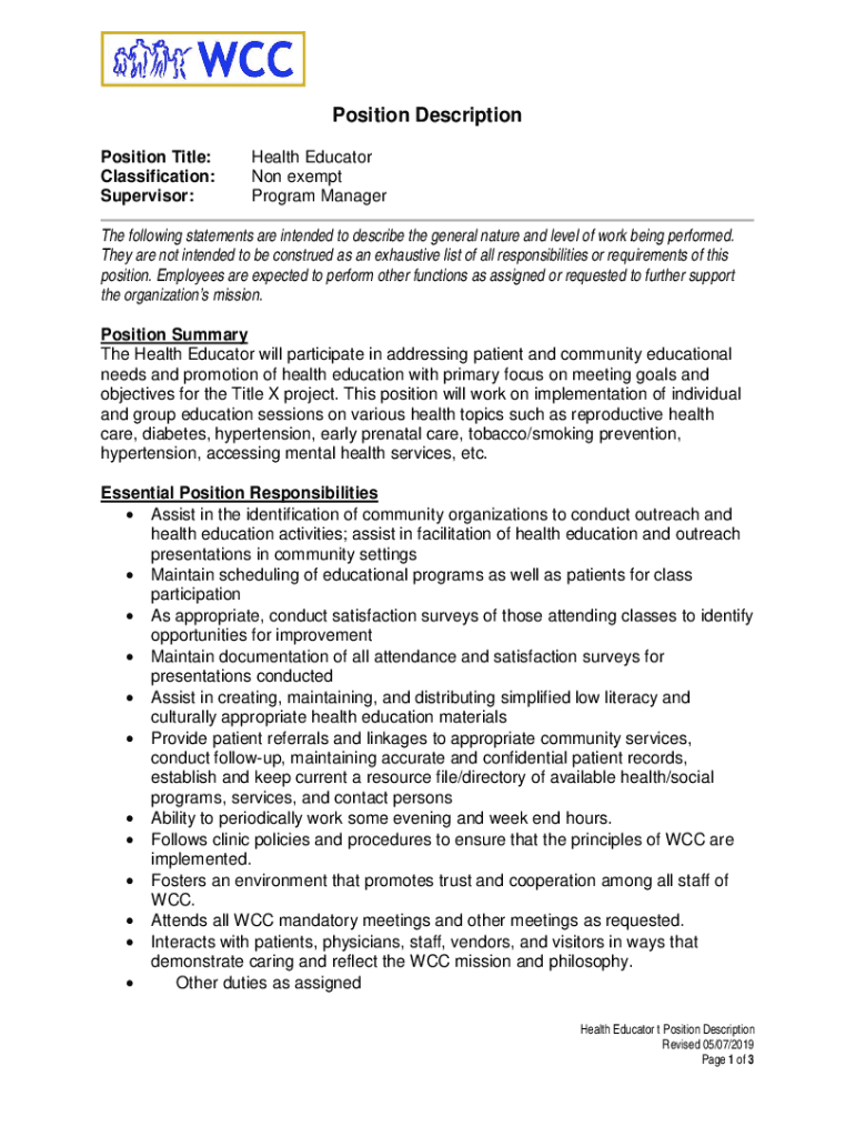 Position Description Position Title: Classification: Supervisor:Health Educator Non-exempt Program Manager following statements are intended to describe the general nature and level of work being
