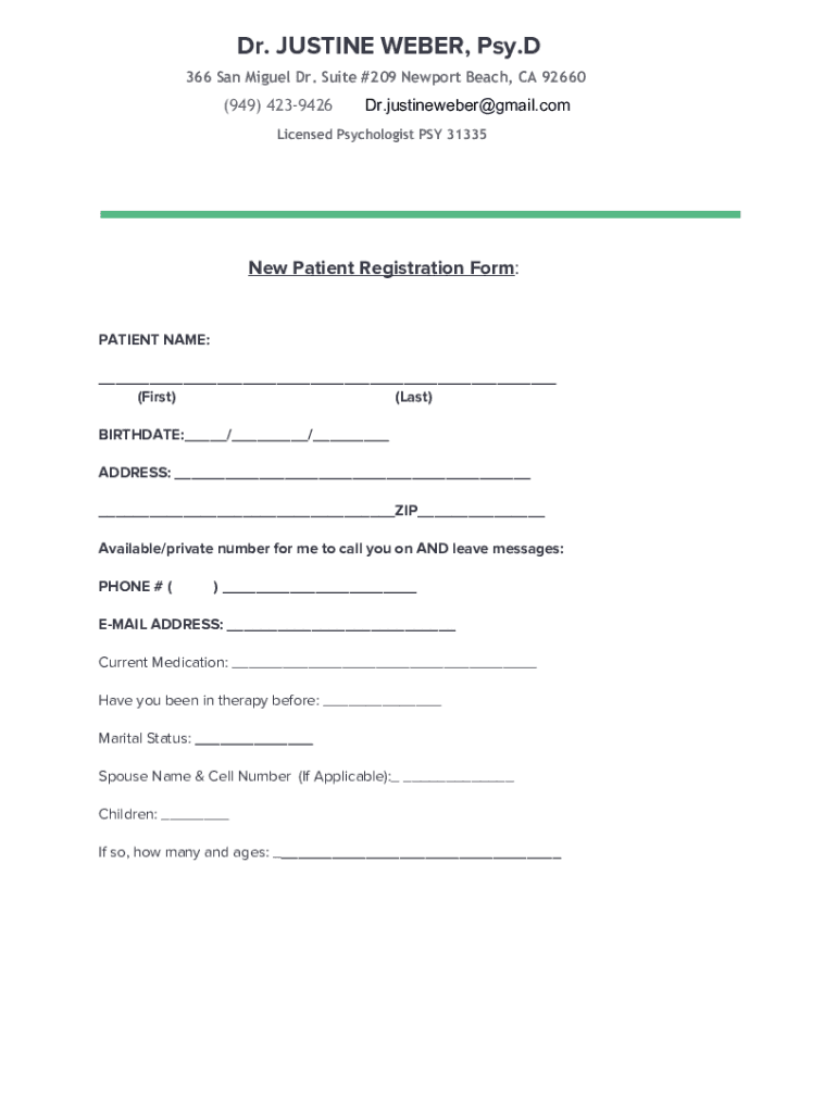 Dr. JUSTINE WEBER, Pay. D 366 San Miguel Dr. Suite #209 Newport Beach, CA 92660 (949)4239426Dr.justineweber@gmail.comLicensed Psychologist PAY 31335 Patient Registration Form: PATIENT NAME: ___ (First)