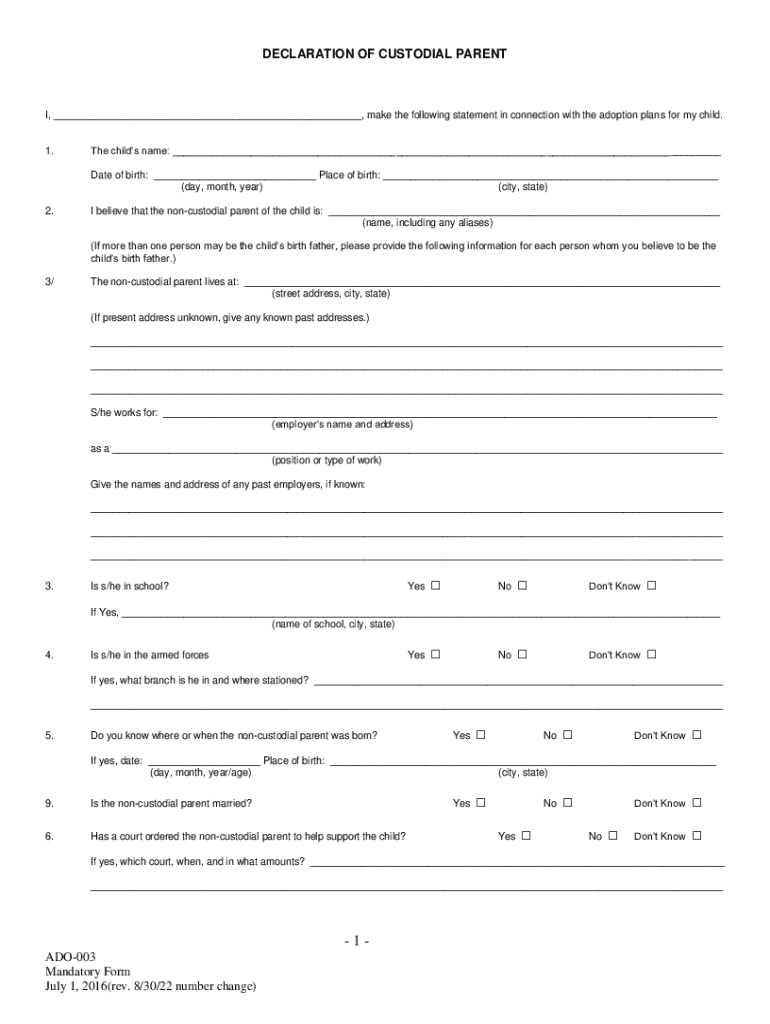 DECLARATION OF CUSTODIAL PARENTS, ___, make the following statement in connection with the adoption plans for my child.1. The children name: ___ Date of birth: ___ Place of birth: ___ (day, month,