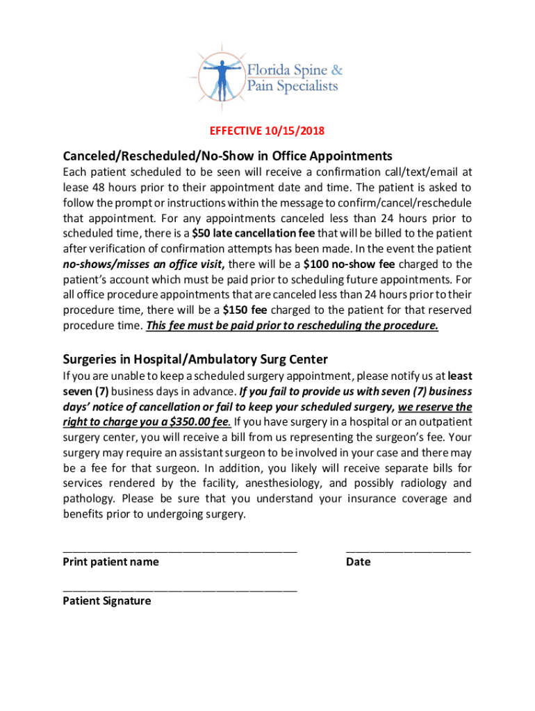 EFFECTIVE 10/15/2018Canceled/Rescheduled/Nohow in Office Appointments Each patient scheduled to be seen will receive a confirmation call/text/email at lease 48 hours prior to their appointment date