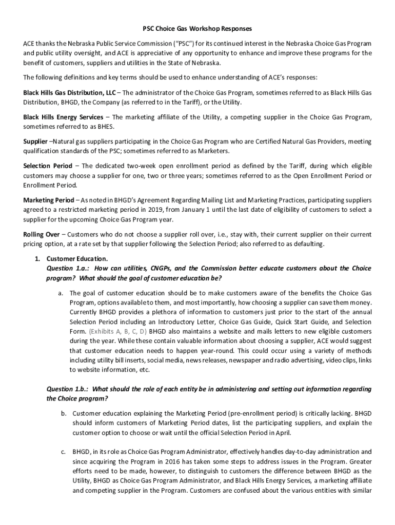 PSC Choice Gas Workshop Responses ACE thanks the Nebraska Public Service Commission (PSC) for its continued interest in the Nebraska Choice Gas Program and public utility oversight, and ACE is appreciative