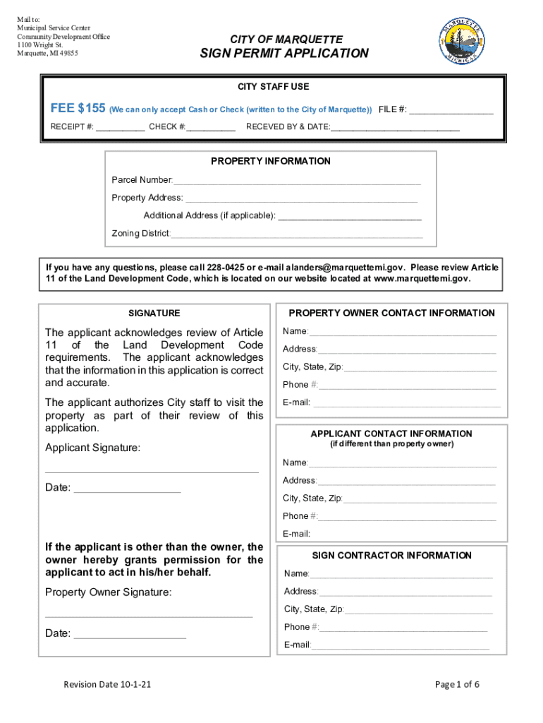 Mail to: Municipal Service Center Community Development Office 1100 Wright St. Marquette, MI 49855PRINT CITY OF MARQUETTESIGN PERMIT APPLICATION CITY STAFF USEFUL $155 (We can only accept Cash or
