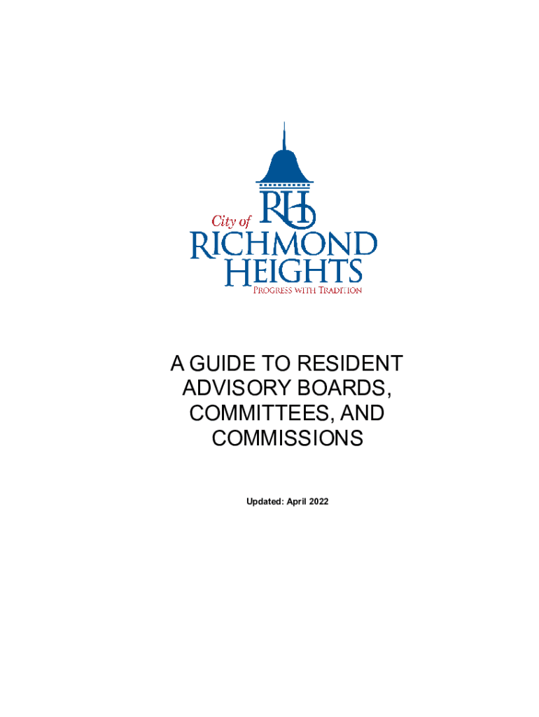A GUIDE TO RESIDENT ADVISORY BOARDS, COMMITTEES, AND COMMISSIONS Updated: April 20221Table of Contents CITY OF RICHMOND HEIGHTS MISSION STATEMENT.2 CITY OFFICIALS AND ADMINISTRATIVE STAFF.....2 RESIDENT