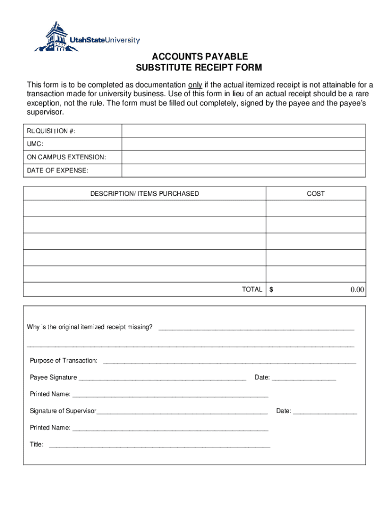 Get the free ACCOUNTS PAYABLE SUBSTITUTE RECEIPT FORM - Utah State University