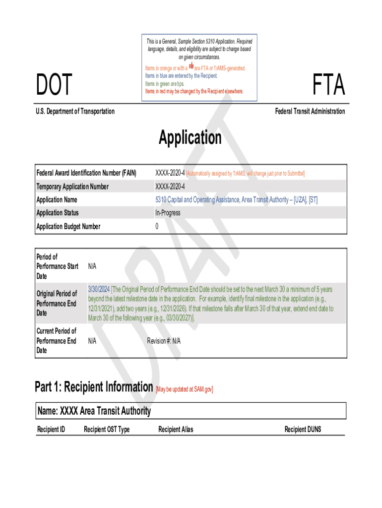 This is a General, Sample Section 5310 Application. Required language, details, and eligibility are subject to change based on given circumstances.DOTFTAItems in orange or with and are FTA or Trams