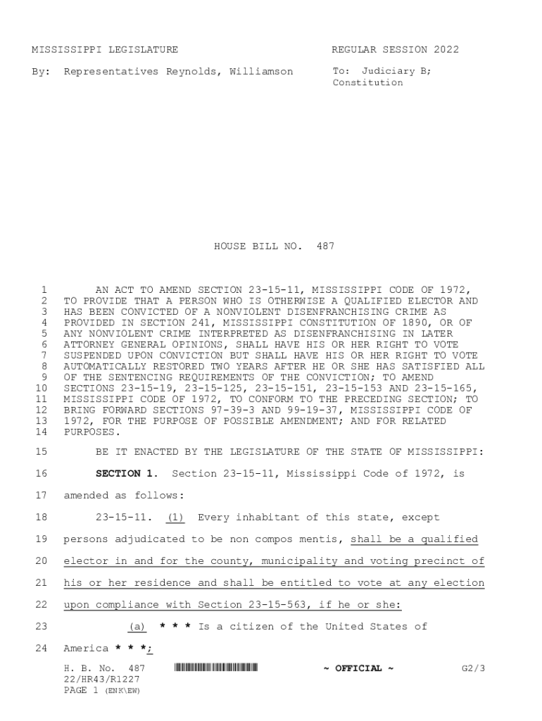 MISSISSIPPI LEGISLATUREREGULAR SESSION 2022By:To: Judiciary B; ConstitutionRepresentatives Reynolds, WilliamsonHOUSE BILL NO.4871 2 3 4 5 6 7 8 9 10 11 12 13 14AN ACT TO AMEND SECTION 231511, MISSISSIPPI