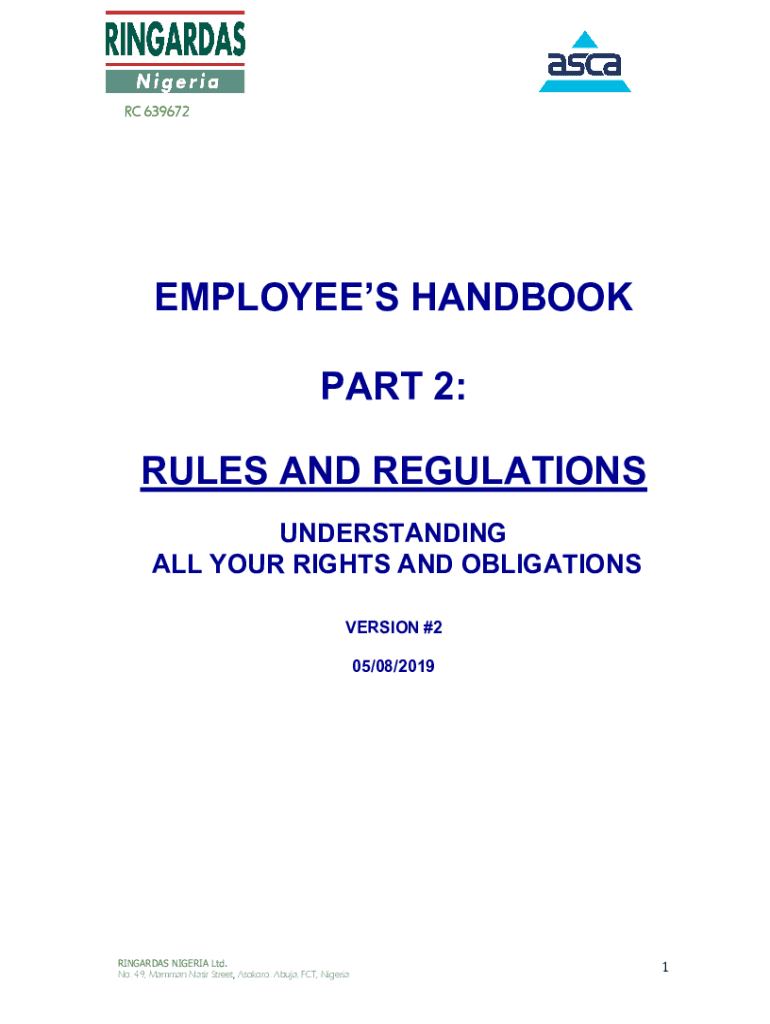 RC 639672EMPLOYEES HANDBOOK PART 2:RULES AND REGULATIONS UNDERSTANDING ALL YOUR RIGHTS AND OBLIGATIONS VERSION #2 05/08/2019RINGARDAS NIGERIA Ltd. No. 49, Mammal Nair Street, Ashore. Abuja, ACT, Nigeria1RC