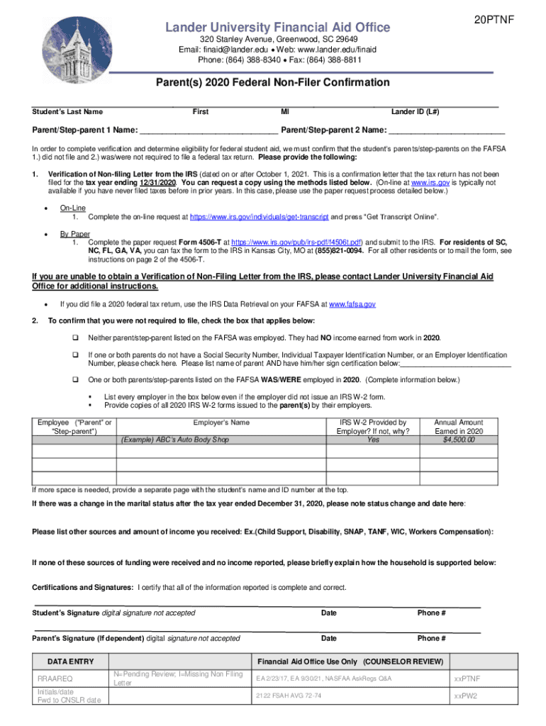 20PTNFLander University Financial Aid Office 320 Stanley Avenue, Greenwood, SC 29649 Email: finaid@lander.edu Web: www.lander.edu/finaid Phone: (864) 3888340 Fax: (864) 3888811Parent(s) 2020 Federal