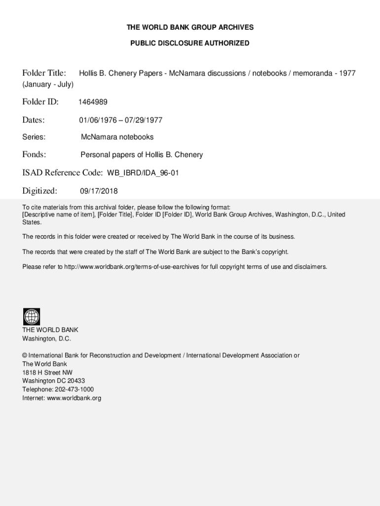 THE WORLD BANK GROUP ARCHIVES PUBLIC DISCLOSURE AUTHORIZEDFolder Title:Hollis B. Cheney Papers McNamara discussions / notebooks / memoranda 1977(January July)Folder ID:1464989Dates:01/06/1976 07/29/1977Series:McNamara