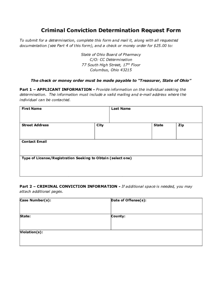 The criminal conviction determination request is a form that allows individuals to disclose any criminal convictions for the purpose of obtaining or renewing a pharmacy license in the state of Ohio.