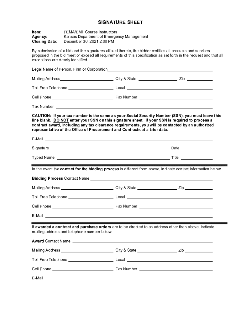 SIGNATURE SHEET Item: Agency: Closing Date:FEMA/EMI Course Instructors Kansas Department of Emergency Management December 30, 2021 2:00 PMB submission of a bid and the signatures affixed thereto,