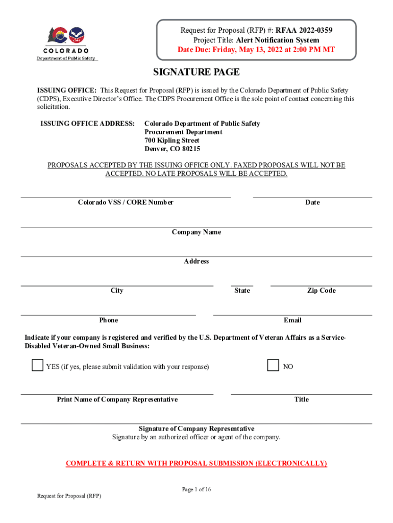 Any organization or individual submitting a proposal in response to an RFP (Request for Proposal) needs to complete the RFP signature page.