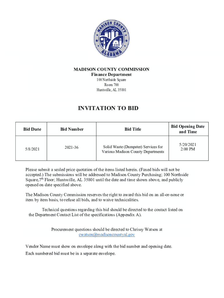 MADISON COUNTY COMMISSION Finance Department 100 Northside Square Room 700 Huntsville, AL 35801INVITATION TO Ibid Dated Numbered Title5/8/2021202136Solid Waste (Dumpster) Services for Various Madison