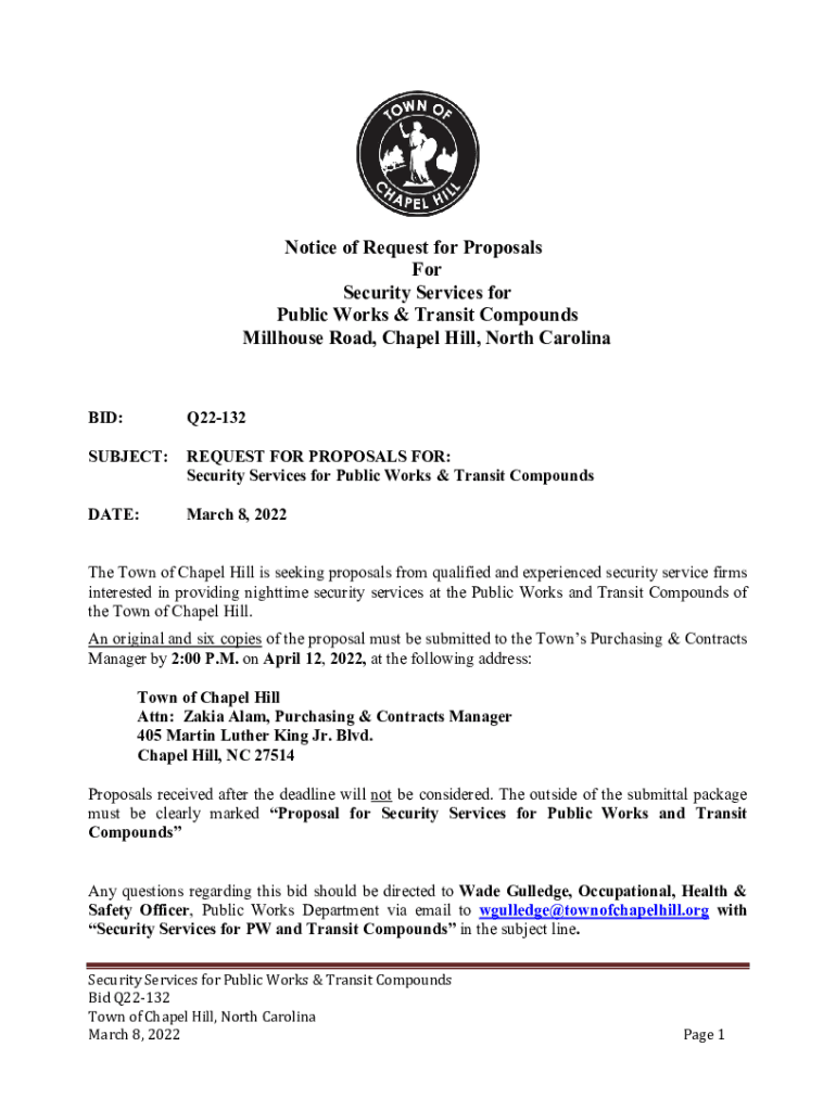 Notice of Request for Proposals For Security Services for Public Works & Transit Compounds Mill house Road, Chapel Hill, North Carolina BID:Q22132SUBJECT:REQUEST FOR PROPOSALS FOR: Security Services