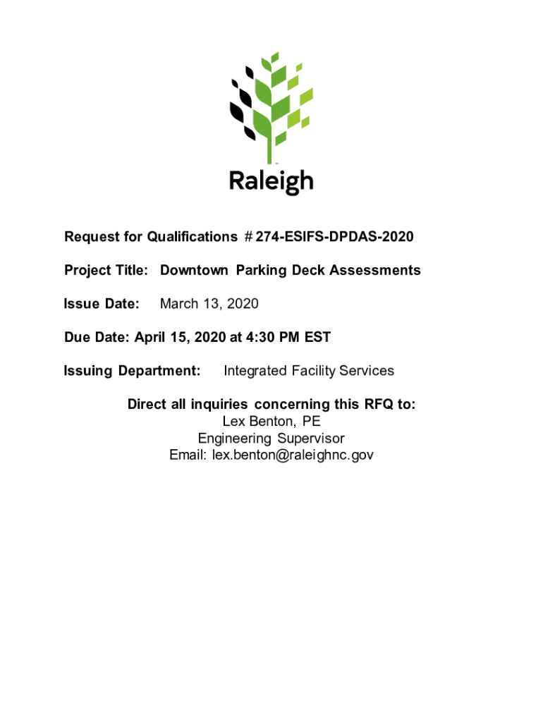 Request for Qualifications # 274ESIFSDPDAS2020 Project Title: Downtown Parking Deck Assessments Issue Date:March 13, 2020Due Date: April 15, 2020, at 4:30 PM EST Issuing Department:Integrated Facility