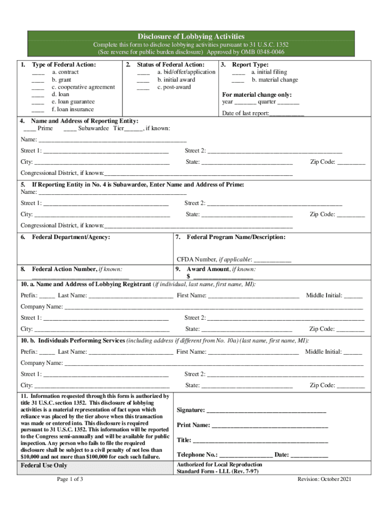 Obtain the disclosure of lobbying activities form from the appropriate authority or organization.