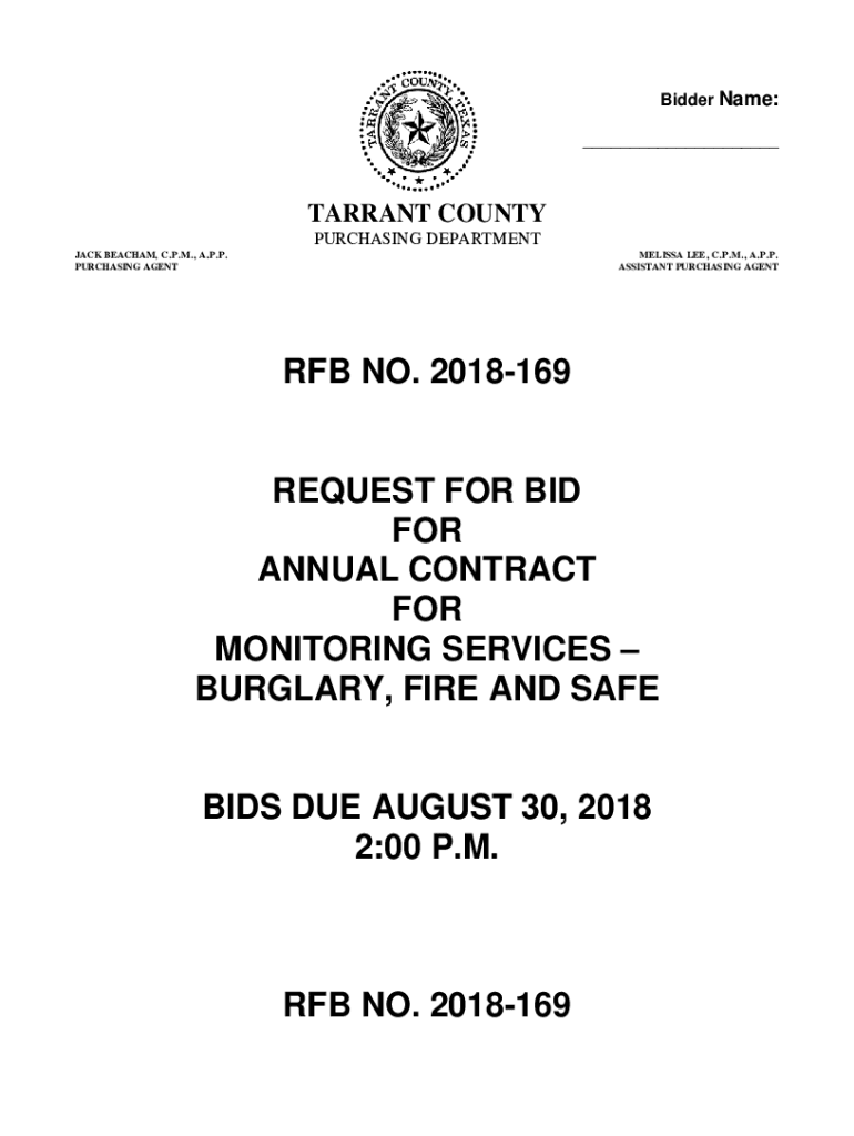 Bidder Name: ___TARRANT COUNTY PURCHASING DEPARTMENT JACK BEA CHAM, C.P.M., A.P.P. PURCHASING AGENTMELISSA LEE, C.P.M., A.P.P. ASSISTANT PURCHASING AGENT NO. 2018169REQUEST FOR BID FOR ANNUAL CONTRACT