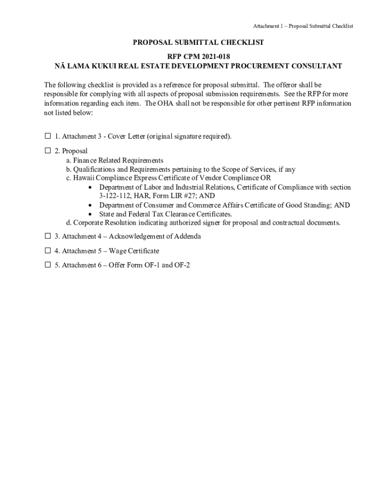 Attachment 1 Proposal Submittal ChecklistPROPOSAL SUBMITTAL CHECKLIST RFP CPM 2021018 N LAMA KIKI REAL ESTATE DEVELOPMENT PROCUREMENT CONSULTANT The following checklist is provided as a reference