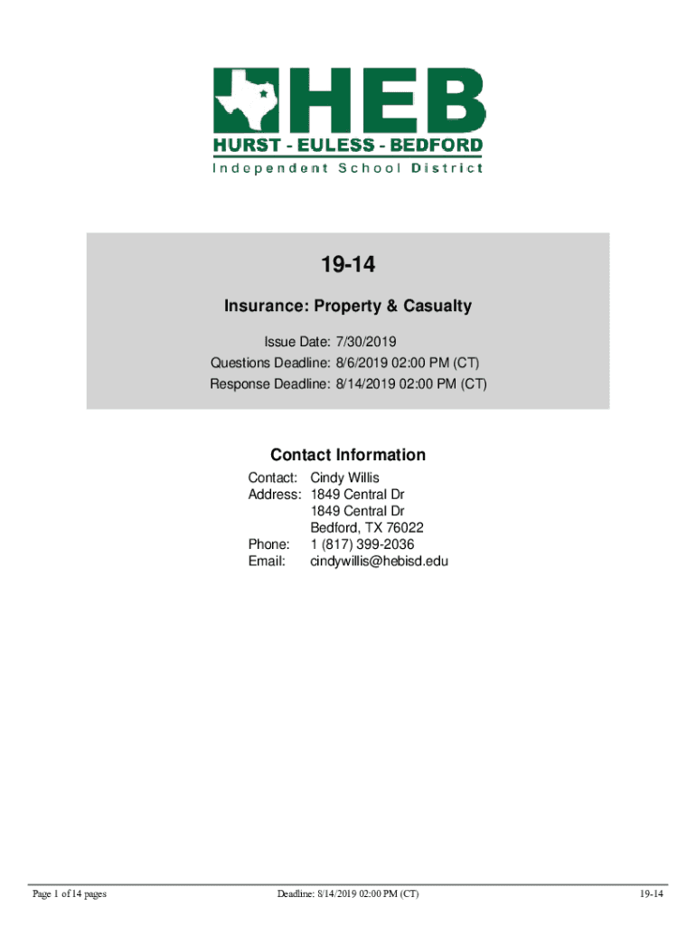1914 Insurance: Property & Casualty Issue Date: 7/30/2019 Questions Deadline: 8/6/2019 02:00 PM (CT) Response Deadline: 8/14/2019 02:00 PM (CT)Contact Information Contact: Cindy Willis Address: 1849