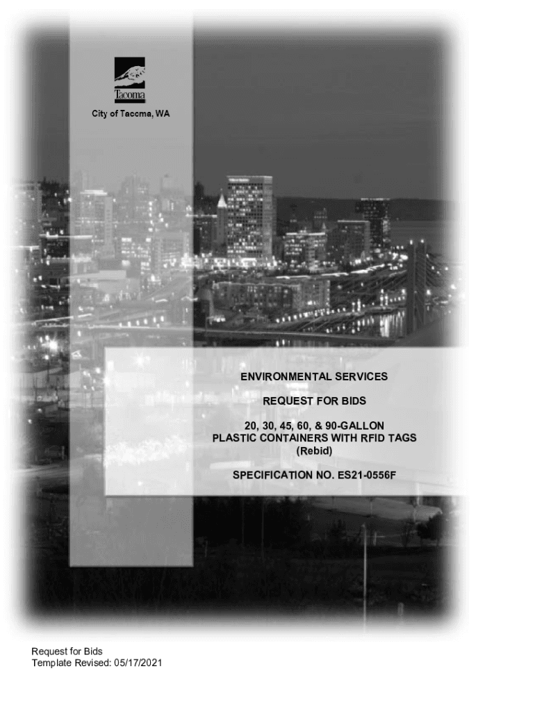 ENVIRONMENTAL SERVICES REQUEST FOR BIDS 20, 30, 45, 60, & 90GALLON PLASTIC CONTAINERS WITH RFID TAGS (Rebid) SPECIFICATION NO. ES210556FRequest for Bids Template Revised: 05/17/2021City of Tacoma