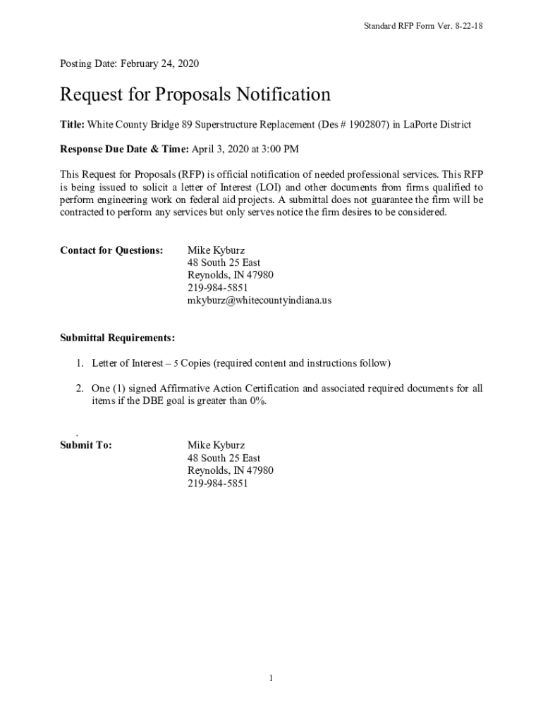 Standard RFP Form Very. 82218Posting Date: February 24, 2020Request for Proposals Notification Title: White County Bridge 89 Superstructure Replacement (DES # 1902807) in Lahore District Response