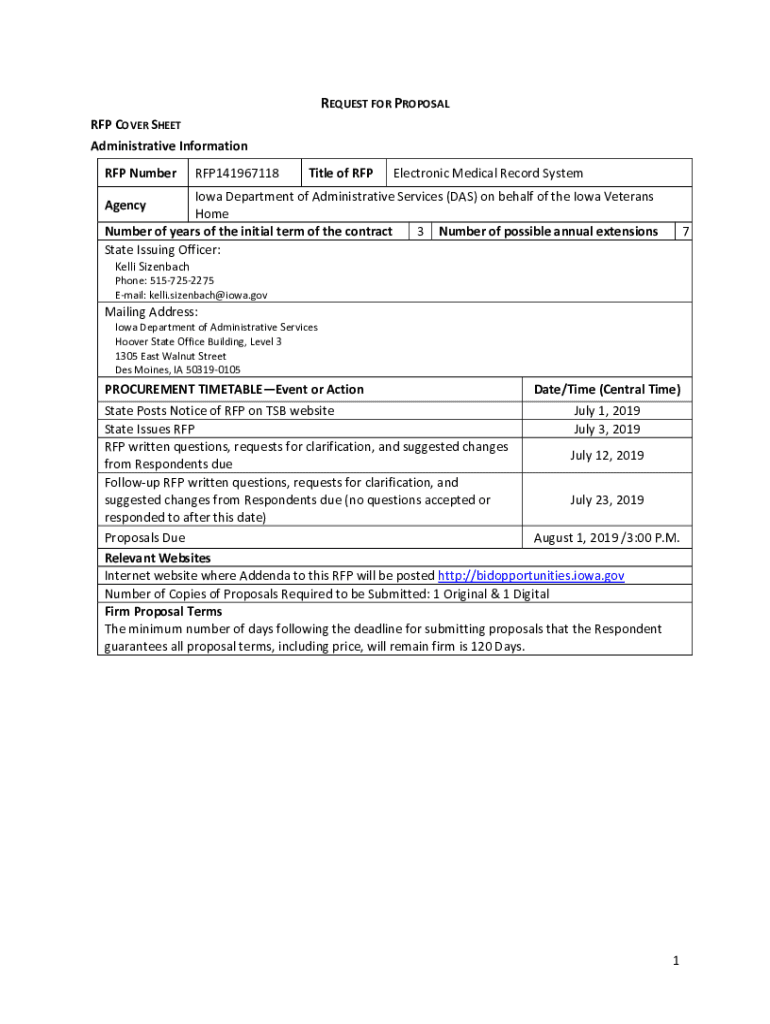 REQUEST FOR PROPOSAL RFP COVER SHEET Administrative Information RFP NumberRFP141967118Title of Electronic Medical Record System Iowa Department of Administrative Services (WAS) on behalf of the Iowa