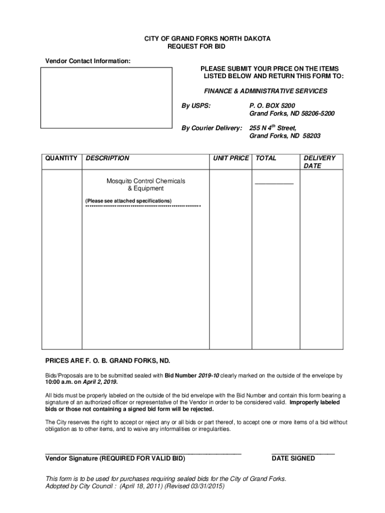 Get the free CITY OF GRAND FORKS NORTH DAKOTA REQUEST FOR BID PLEASE SUBMIT YOUR ...
