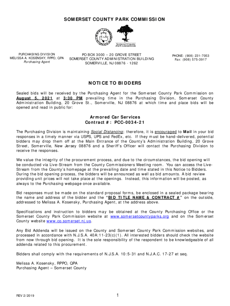 SOMERSET COUNTY PARK COMMISSIONPURCHASING DIVISION MELISSA A. KERENSKY, RPO, PA Purchasing Agent PO BOX 3000 20 GROVE STREET SOMERSET COUNTY ADMINISTRATION BUILDING SOMERVILLE, NJ 08876 1262PHONE: