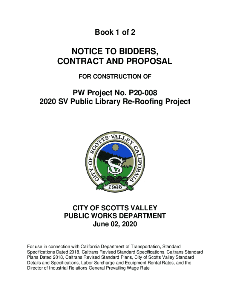 Book 1 of 2NOTICE TO BIDDERS, CONTRACT AND PROPOSAL FOR CONSTRUCTION OF PW Project No. P20008 2020 SV Public Library Reproofing Projection OF SCOTT VALLEY PUBLIC WORKS DEPARTMENT June 02, 2020, For