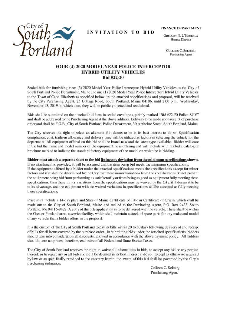 I NEVI TAT I O N TO B ID FINANCE DEPARTMENT GREGORY N. LHEUREUX Finance DirectorCOLLEEN C. SELLER Purchasing AgentFOUR (4) 2020 MODEL YEAR POLICE INTERCEPTOR HYBRID UTILITY VEHICLES Bid #2220 Sealed