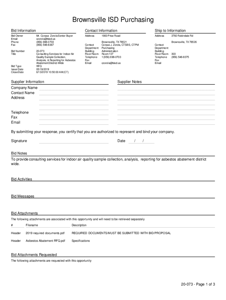 Vendors need to complete the required forms provided by Brownsville ISD and submit them as instructed.