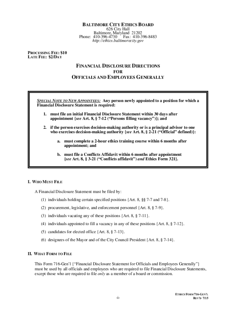 BALTIMORE CITY ETHICS BOARD626 City Hall Baltimore, Maryland 21202 Phone: 4103964730 Fax: 4103968483 http://ethics.baltimorecity.gov PROCESSING FEE: $10 LATE FEE: $2/FINANCIAL DISCLOSURE DIRECTIONS