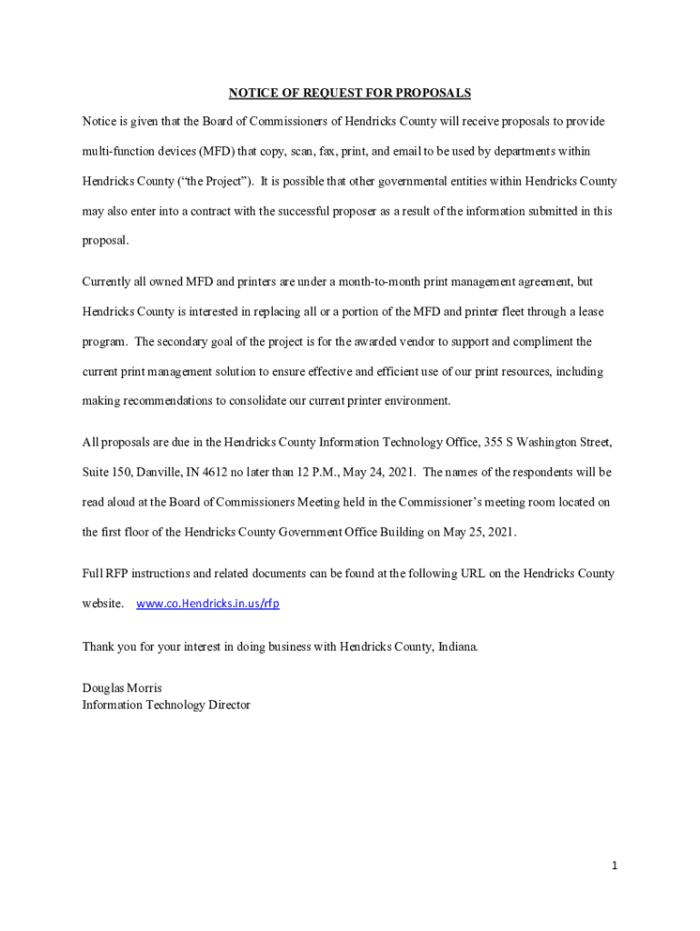 NOTICE OF REQUEST FOR PROPOSALS Notice is given that the Board of Commissioners of Hendricks County will receive proposals to provide multifunction devices (MID) that copy, scan, fax, print, and email