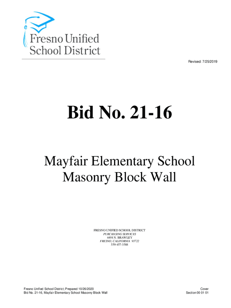 Revised: 7/25/2019Bid No. 2116 Mayfair Elementary School Masonry Block Alfresco UNIFIED SCHOOL DISTRICT PURCHASING SERVICES 4498 N. BRADLEY FRESNO, CALIFORNIA 93722 5594573588Fresno Unified School