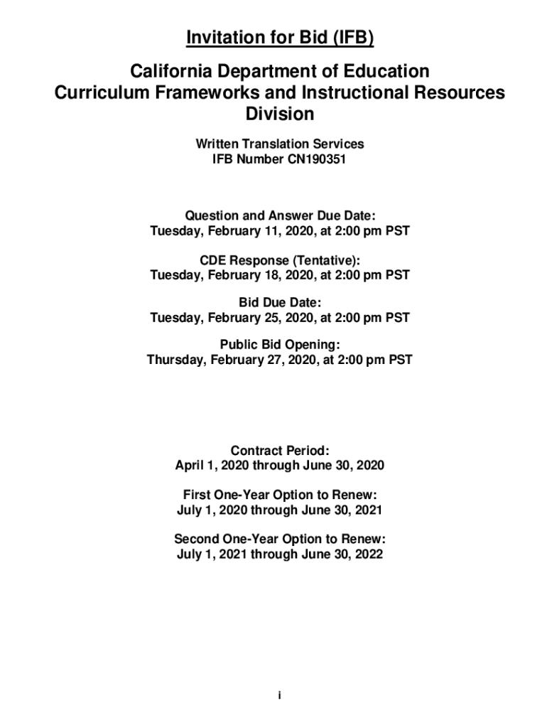 Invitation for Bid (IF) California Department of Education Curriculum Frameworks and Instructional Resources Division Written Translation Services IF Number CN190351Question and Answer Due Date: Tuesday,
